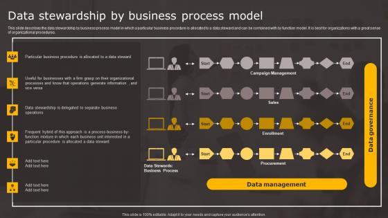 This slide describes the data stewardship by business process model in which a particular business procedure is allocated to a data steward and can be combined with by function model. It is best for organizations with a great sense of organizational procedures. If your project calls for a presentation, then Slidegeeks is your go to partner because we have professionally designed, easy to edit templates that are perfect for any presentation. After downloading, you can easily edit Data Stewardship By Business Data Stewardship In Business Processes Diagrams Pdf and make the changes accordingly. You can rearrange slides or fill them with different images. Check out all the handy templates This slide describes the data stewardship by business process model in which a particular business procedure is allocated to a data steward and can be combined with by function model. It is best for organizations with a great sense of organizational procedures.