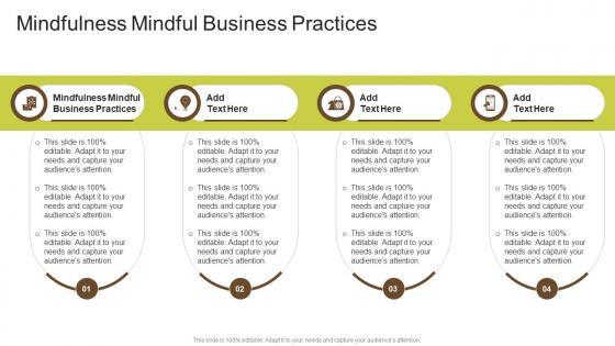 Presenting our innovatively designed set of slides titled Mindfulness Mindful Business Practices In Powerpoint And Google Slides Cpb. This completely editable PowerPoint graphic exhibits Mindfulness Mindful Business Practices that will help you convey the message impactfully. It can be accessed with Google Slides and is available in both standard screen and widescreen aspect ratios. Apart from this, you can download this well-structured PowerPoint template design in different formats like PDF, JPG, and PNG. So, click the download button now to gain full access to this PPT design. Our Mindfulness Mindful Business Practices In Powerpoint And Google Slides Cpb are topically designed to provide an attractive backdrop to any subject. Use them to look like a presentation pro.