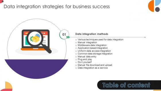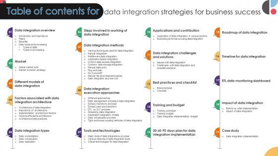 Slidegeeks is here to make your presentations a breeze with Table Of Contents Data Integration Strategies For Business Success With our easy-to-use and customizable templates, you can focus on delivering your ideas rather than worrying about formatting. With a variety of designs to choose from, you are sure to find one that suits your needs. And with animations and unique photos, illustrations, and fonts, you can make your presentation pop. So whether you are giving a sales pitch or presenting to the board, make sure to check out Slidegeeks first Our Table Of Contents Data Integration Strategies For Business Success are topically designed to provide an attractive backdrop to any subject. Use them to look like a presentation pro.