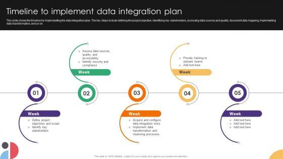 This slide shows the timeline for implementing the data integration plan. The key steps include defining the project objective, identifying key stakeholders, accessing data sources and quality, document data mapping, implementing data transformation, and so on. If your project calls for a presentation, then Slidegeeks is your go-to partner because we have professionally designed, easy-to-edit templates that are perfect for any presentation. After downloading, you can easily edit Timeline To Implement Data Integration Plan Data Integration Strategies For Business and make the changes accordingly. You can rearrange slides or fill them with different images. Check out all the handy templates This slide shows the timeline for implementing the data integration plan. The key steps include defining the project objective, identifying key stakeholders, accessing data sources and quality, document data mapping, implementing data transformation, and so on.