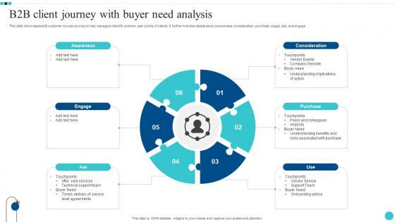 This slide showcases b2b customer circular journey to help managers identify common pain points of clients. It further includes details about awareness, consideration, purchase, usage, ask, and engage. Pitch your topic with ease and precision using this B2B Client Journey With Buyer Need Analysis Sample Pdf. This layout presents information on Consideration, Awareness, Buyer Need Analysis, Technical Support Team. It is also available for immediate download and adjustment. So, changes can be made in the color, design, graphics or any other component to create a unique layout. This slide showcases b2b customer circular journey to help managers identify common pain points of clients. It further includes details about awareness, consideration, purchase, usage, ask, and engage.