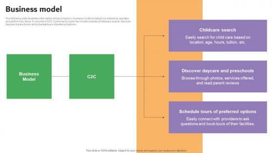 The following slide illustrates information about companys business model showing how enterprise operates and perform key tasks. It consists of C2C customer to customer model consists of childcare search, discover daycare and preschools and schedule tours of preferred options. Boost your pitch with our creative Business Model Carelulu Shareholders Fund Raising Pitch Deck Mockup Pdf. Deliver an awe inspiring pitch that will mesmerize everyone. Using these presentation templates you will surely catch everyones attention. You can browse the ppts collection on our website. We have researchers who are experts at creating the right content for the templates. So you do not have to invest time in any additional work. Just grab the template now and use them. The following slide illustrates information about companys business model showing how enterprise operates and perform key tasks. It consists of C2C customer to customer model consists of childcare search, discover daycare and preschools and schedule tours of preferred options.