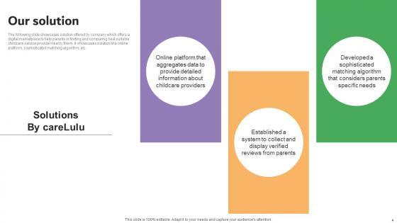 The following slide showcases solution offered by company which offers a digital marketplace to help parents in finding and comparing best suitable childcare service provider nearby them. It showcases solution like online platform, sophisticated matching algorithm, etc. Crafting an eye catching presentation has never been more straightforward. Let your presentation shine with this tasteful yet straightforward Our Solution Carelulu Shareholders Fund Raising Pitch Deck Summary Pdf template. It offers a minimalistic and classy look that is great for making a statement. The colors have been employed intelligently to add a bit of playfulness while still remaining professional. Construct the ideal Our Solution Carelulu Shareholders Fund Raising Pitch Deck Summary Pdf that effortlessly grabs the attention of your audience Begin now and be certain to wow your customers The following slide showcases solution offered by company which offers a digital marketplace to help parents in finding and comparing best suitable childcare service provider nearby them. It showcases solution like online platform, sophisticated matching algorithm, etc.