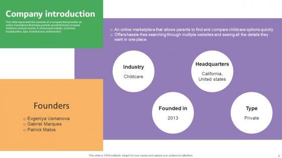 This slide represents the overview of a company that provides an online marketplace that helps parents quickly find and compare childcare services nearby. It showcases industry, customer, headquarters, type, founded year and founders. Slidegeeks is one of the best resources for PowerPoint templates. You can download easily and regulate Company Introduction Carelulu Shareholders Fund Raising Pitch Deck Demonstration Pdf for your personal presentations from our wonderful collection. A few clicks is all it takes to discover and get the most relevant and appropriate templates. Use our Templates to add a unique zing and appeal to your presentation and meetings. All the slides are easy to edit and you can use them even for advertisement purposes. This slide represents the overview of a company that provides an online marketplace that helps parents quickly find and compare childcare services nearby. It showcases industry, customer, headquarters, type, founded year and founders.