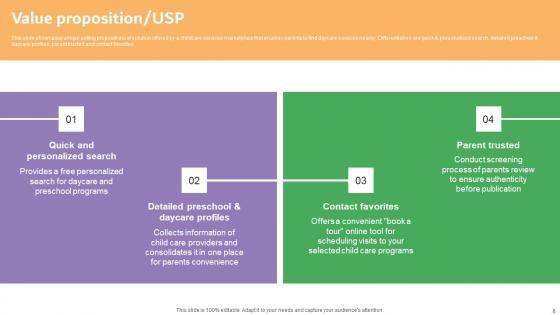 This slide showcases unique selling propositions of solution offered by a childcare services marketplace that enables parents to find daycare services nearby. Differentiators are quick and personalized search, detailed preschool and daycare profiles, parent trusted and contact favorites. Welcome to our selection of the Value Proposition Usp Carelulu Shareholders Fund Raising Pitch Deck Professional Pdf. These are designed to help you showcase your creativity and bring your sphere to life. Planning and Innovation are essential for any business that is just starting out. This collection contains the designs that you need for your everyday presentations. All of our PowerPoints are 100 percent editable, so you can customize them to suit your needs. This multi purpose template can be used in various situations. Grab these presentation templates today This slide showcases unique selling propositions of solution offered by a childcare services marketplace that enables parents to find daycare services nearby. Differentiators are quick and personalized search, detailed preschool and daycare profiles, parent trusted and contact favorites.