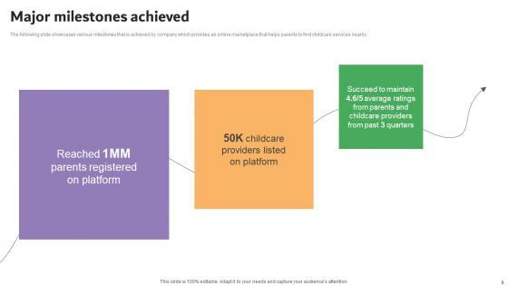 The following slide showcases various milestones that is achieved by company which provides an online marketplace that helps parents to find childcare services nearby. If your project calls for a presentation, then Slidegeeks is your go to partner because we have professionally designed, easy to edit templates that are perfect for any presentation. After downloading, you can easily edit Major Milestones Achieved Carelulu Shareholders Fund Raising Pitch Deck Designs Pdf and make the changes accordingly. You can rearrange slides or fill them with different images. Check out all the handy templates The following slide showcases various milestones that is achieved by company which provides an online marketplace that helps parents to find childcare services nearby.