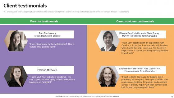 The following slide showcases perceptive of customers for a company which provides an online marketplace that helps parents to find and compare childcare services nearby. Create an editable Client Testimonials Carelulu Shareholders Fund Raising Pitch Deck Portrait Pdf that communicates your idea and engages your audience. Whether you are presenting a business or an educational presentation, pre designed presentation templates help save time. Client Testimonials Carelulu Shareholders Fund Raising Pitch Deck Portrait Pdf is highly customizable and very easy to edit, covering many different styles from creative to business presentations. Slidegeeks has creative team members who have crafted amazing templates. So, go and get them without any delay. The following slide showcases perceptive of customers for a company which provides an online marketplace that helps parents to find and compare childcare services nearby.