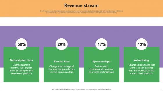 The following slide showcases revenue streams of an online marketplace that helps parents to find and compare childcare services nearby. It generates revenue from service fees, sponsorships, subscription fees and advertising. Coming up with a presentation necessitates that the majority of the effort goes into the content and the message you intend to convey. The visuals of a PowerPoint presentation can only be effective if it supplements and supports the story that is being told. Keeping this in mind our experts created Revenue Stream Carelulu Shareholders Fund Raising Pitch Deck Information Pdf to reduce the time that goes into designing the presentation. This way, you can concentrate on the message while our designers take care of providing you with the right template for the situation. The following slide showcases revenue streams of an online marketplace that helps parents to find and compare childcare services nearby. It generates revenue from service fees, sponsorships, subscription fees and advertising.