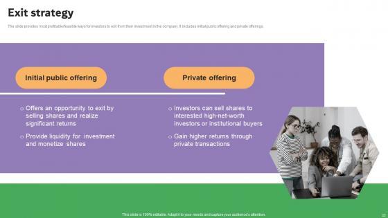 The slide provides most profitable feasible ways for investors to exit from their investment in the company. It includes initial public offering and private offerings. From laying roadmaps to briefing everything in detail, our templates are perfect for you. You can set the stage with your presentation slides. All you have to do is download these easy to edit and customizable templates. Exit Strategy Carelulu Shareholders Fund Raising Pitch Deck Infographics Pdf will help you deliver an outstanding performance that everyone would remember and praise you for. Do download this presentation today. The slide provides most profitable feasible ways for investors to exit from their investment in the company. It includes initial public offering and private offerings.