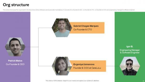 This slide showcases the organization structure of an online childcare service provider marketplace. It consists of co founder and CEO, co founder and CTO, co founder and COO and engineering manager and software engineer. Are you in need of a template that can accommodate all of your creative concepts This one is crafted professionally and can be altered to fit any style. Use it with Google Slides or PowerPoint. Include striking photographs, symbols, depictions, and other visuals. Fill, move around, or remove text boxes as desired. Test out color palettes and font mixtures. Edit and save your work, or work with colleagues. Download Org Structure Carelulu Shareholders Fund Raising Pitch Deck Clipart Pdf and observe how to make your presentation outstanding. Give an impeccable presentation to your group and make your presentation unforgettable. This slide showcases the organization structure of an online childcare service provider marketplace. It consists of co founder and CEO, co founder and CTO, co founder and COO and engineering manager and software engineer.