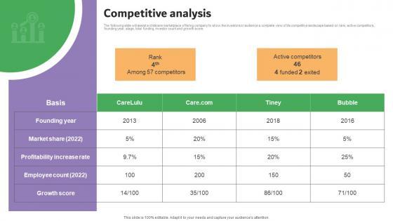 The following slide will assist a childcare marketplace offering company to show the investors or audience a complete view of its competitive landscape based on rank, active competitors, founding year, stage, total funding, investor count and growth score. Want to ace your presentation in front of a live audience Our Competitive Analysis Carelulu Shareholders Fund Raising Pitch Deck Graphics Pdf can help you do that by engaging all the users towards you. Slidegeeks experts have put their efforts and expertise into creating these impeccable powerpoint presentations so that you can communicate your ideas clearly. Moreover, all the templates are customizable, and easy to edit and downloadable. Use these for both personal and commercial use. The following slide will assist a childcare marketplace offering company to show the investors or audience a complete view of its competitive landscape based on rank, active competitors, founding year, stage, total funding, investor count and growth score.