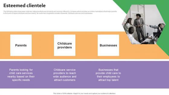 The following slide showcases customer categories that uses products and services offered by company which provides an online marketplace that helps parents to find and compare childcare services nearby. Its customers segments consists of parents, childcare services and businesses. Get a simple yet stunning designed Esteemed Clientele Carelulu Shareholders Fund Raising Pitch Deck Inspiration Pdf. It is the best one to establish the tone in your meetings. It is an excellent way to make your presentations highly effective. So, download this PPT today from Slidegeeks and see the positive impacts. Our easy to edit Esteemed Clientele Carelulu Shareholders Fund Raising Pitch Deck Inspiration Pdf can be your go to option for all upcoming conferences and meetings. So, what are you waiting for Grab this template today. The following slide showcases customer categories that uses products and services offered by company which provides an online marketplace that helps parents to find and compare childcare services nearby. Its customers segments consists of parents, childcare services and businesses.