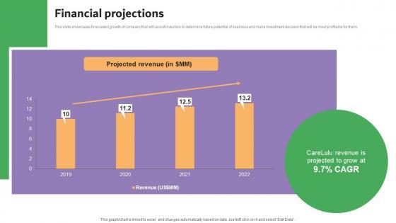 This slide showcases forecasted growth of company that will assist investors to determine future potential of business and make investment decision that will be most profitable for them. Slidegeeks is here to make your presentations a breeze with Financial Projections Carelulu Shareholders Fund Raising Pitch Deck Slides Pdf With our easy to use and customizable templates, you can focus on delivering your ideas rather than worrying about formatting. With a variety of designs to choose from, you are sure to find one that suits your needs. And with animations and unique photos, illustrations, and fonts, you can make your presentation pop. So whether you are giving a sales pitch or presenting to the board, make sure to check out Slidegeeks first This slide showcases forecasted growth of company that will assist investors to determine future potential of business and make investment decision that will be most profitable for them.