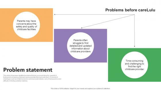 This slide showcases identified problems that are commonly faced by parents in finding and comparing childcare service provider that best suits them. It consist of challenges such as limited access to service provider details, lack of transparency and difficulty in finding suitable matches. Make sure to capture your audiences attention in your business displays with our gratis customizable Problem Statement Carelulu Shareholders Fund Raising Pitch Deck Microsoft Pdf. These are great for business strategies, office conferences, capital raising or task suggestions. If you desire to acquire more customers for your tech business and ensure they stay satisfied, create your own sales presentation with these plain slides. This slide showcases identified problems that are commonly faced by parents in finding and comparing childcare service provider that best suits them. It consist of challenges such as limited access to service provider details, lack of transparency and difficulty in finding suitable matches.