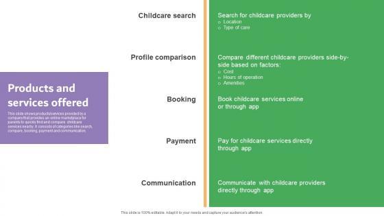 This slide shows products services provided by a company that provides an online marketplace for parents to quickly find and compare childcare services nearby. It consists of categories like search, compare, booking, payment and communication. Formulating a presentation can take up a lot of effort and time, so the content and message should always be the primary focus. The visuals of the PowerPoint can enhance the presenters message, so our Products And Services Offered Carelulu Shareholders Fund Raising Pitch Deck Ideas Pdf was created to help save time. Instead of worrying about the design, the presenter can concentrate on the message while our designers work on creating the ideal templates for whatever situation is needed. Slidegeeks has experts for everything from amazing designs to valuable content, we have put everything into Products And Services Offered Carelulu Shareholders Fund Raising Pitch Deck Ideas Pdf This slide shows products services provided by a company that provides an online marketplace for parents to quickly find and compare childcare services nearby. It consists of categories like search, compare, booking, payment and communication.