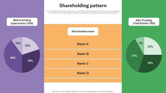 This slide depicts the details related to the shareholding patterns representing the share ownership pattern of companies. It consists of details related to shareholders and their shares before and after funding This modern and well arranged Shareholding Pattern Carelulu Shareholders Fund Raising Pitch Deck Graphics Pdf provides lots of creative possibilities. It is very simple to customize and edit with the Powerpoint Software. Just drag and drop your pictures into the shapes. All facets of this template can be edited with Powerpoint, no extra software is necessary. Add your own material, put your images in the places assigned for them, adjust the colors, and then you can show your slides to the world, with an animated slide included. This slide depicts the details related to the shareholding patterns representing the share ownership pattern of companies. It consists of details related to shareholders and their shares before and after funding
