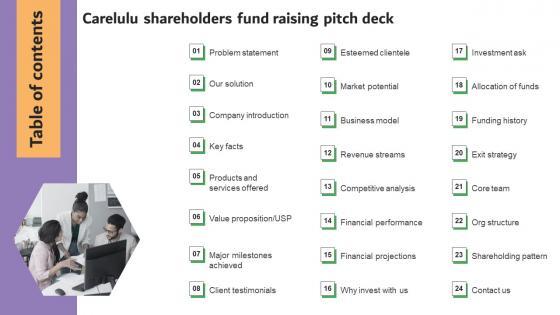 This Table Of Contents Carelulu Shareholders Fund Raising Pitch Deck Microsoft Pdf is perfect for any presentation, be it in front of clients or colleagues. It is a versatile and stylish solution for organizing your meetings. The Table Of Contents Carelulu Shareholders Fund Raising Pitch Deck Microsoft Pdf features a modern design for your presentation meetings. The adjustable and customizable slides provide unlimited possibilities for acing up your presentation. Slidegeeks has done all the homework before launching the product for you. So, do not wait, grab the presentation templates today Our Table Of Contents Carelulu Shareholders Fund Raising Pitch Deck Microsoft Pdf are topically designed to provide an attractive backdrop to any subject. Use them to look like a presentation pro.