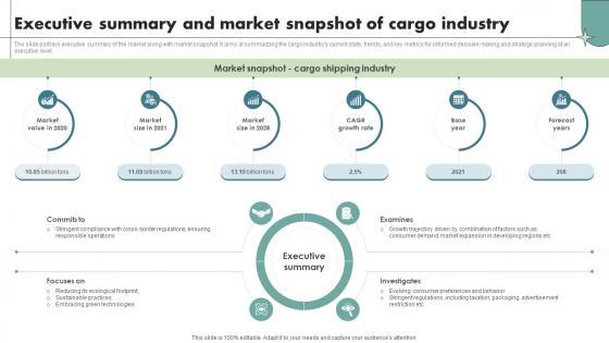 The slide portrays executive summary of the market along with market snapshot. It aims at summarizing the cargo industrys current state, trends, and key metrics for informed decision-making and strategic planning at an executive level. Present like a pro with Executive Summary And Market Snapshot Of Cargo Industry Maritime Shipping Industry IR SS V. Create beautiful presentations together with your team, using our easy-to-use presentation slides. Share your ideas in real-time and make changes on the fly by downloading our templates. So whether you are in the office, on the go, or in a remote location, you can stay in sync with your team and present your ideas with confidence. With Slidegeeks presentation got a whole lot easier. Grab these presentations today. The slide portrays executive summary of the market along with market snapshot. It aims at summarizing the cargo industrys current state, trends, and key metrics for informed decision-making and strategic planning at an executive level.