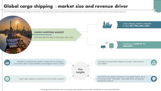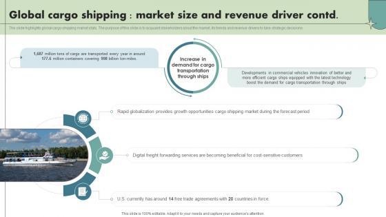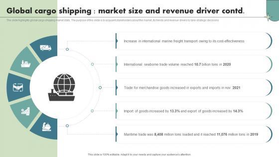 The slide highlights global cargo shipping market stats. The purpose of this slide is to acquaint stakeholders about the market, its trends and revenue drivers to take strategic decisions. Find highly impressive Global Cargo Shipping Market Size And Revenue Driver Maritime Shipping Industry IR SS V on Slidegeeks to deliver a meaningful presentation. You can save an ample amount of time using these presentation templates. No need to worry to prepare everything from scratch because Slidegeeks experts have already done a huge research and work for you. You need to download Global Cargo Shipping Market Size And Revenue Driver Maritime Shipping Industry IR SS V for your upcoming presentation. All the presentation templates are 100 percent editable and you can change the color and personalize the content accordingly. Download now The slide highlights global cargo shipping market stats. The purpose of this slide is to acquaint stakeholders about the market, its trends and revenue drivers to take strategic decisions.