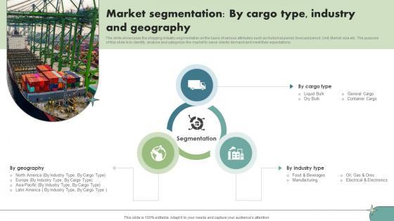 The slide showcases the shipping industry segmentation on the basis of various attributes such as historical period, forecast period, Unit, Market size etc. The purpose of this slide is to identify, analyse and categorize the market to serve clients demand and meet their expectations. This Market Segmentation By Cargo Type Industry And Geography Maritime Shipping Industry IR SS V is perfect for any presentation, be it in front of clients or colleagues. It is a versatile and stylish solution for organizing your meetings. The Market Segmentation By Cargo Type Industry And Geography Maritime Shipping Industry IR SS V features a modern design for your presentation meetings. The adjustable and customizable slides provide unlimited possibilities for acing up your presentation. Slidegeeks has done all the homework before launching the product for you. So, do not wait, grab the presentation templates today The slide showcases the shipping industry segmentation on the basis of various attributes such as historical period, forecast period, Unit, Market size etc. The purpose of this slide is to identify, analyse and categorize the market to serve clients demand and meet their expectations.