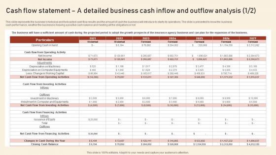 This slide represents the businesss historical and forecasted cash flow results and the amount of cash the business will introduce to starts its operations. The slide is presented to know the business cash performance, weather the business is heaving a positive cash balance and meeting all the obligations or not. Want to ace your presentation in front of a live audience Our Cash Flow Statement A Detailed Business Cash Inflow And Outflow Assurant Insurance Agency Mockup Pdf can help you do that by engaging all the users towards you. Slidegeeks experts have put their efforts and expertise into creating these impeccable powerpoint presentations so that you can communicate your ideas clearly. Moreover, all the templates are customizable, and easy-to-edit and downloadable. Use these for both personal and commercial use. This slide represents the businesss historical and forecasted cash flow results and the amount of cash the business will introduce to starts its operations. The slide is presented to know the business cash performance, weather the business is heaving a positive cash balance and meeting all the obligations or not.