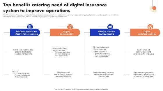 The following slide outlines major benefits which insurance companies can cater showing need of technology to improve operations. Key benefits includes predictive analytics for effective risk assessments, legacy transformation, effective customer journey mapping and digital workplace solutions. Explore a selection of the finest Improving Customer Satisfaction Top Benefits Catering Need Of Digital Insurance System here. With a plethora of professionally designed and pre-made slide templates, you can quickly and easily find the right one for your upcoming presentation. You can use our Improving Customer Satisfaction Top Benefits Catering Need Of Digital Insurance System to effectively convey your message to a wider audience. Slidegeeks has done a lot of research before preparing these presentation templates. The content can be personalized and the slides are highly editable. Grab templates today from Slidegeeks. The following slide outlines major benefits which insurance companies can cater showing need of technology to improve operations. Key benefits includes predictive analytics for effective risk assessments, legacy transformation, effective customer journey mapping and digital workplace solutions.