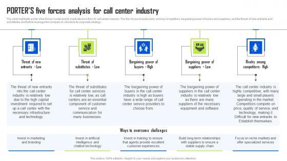 The slide highlights porters five forces model and its implications in the US call center industry. The five forces include rivalry among competitors, bargaining power of buyers and suppliers, and the threat of new entrants and substitutes and further leverage the company to structure its corporate strategy. The best PPT templates are a great way to save time, energy, and resources. Slidegeeks have 100 percent editable powerpoint slides making them incredibly versatile. With these quality presentation templates, you can create a captivating and memorable presentation by combining visually appealing slides and effectively communicating your message. Download Porters Five Forces Analysis For Call Center Industry BPO Center Business Plan Guidelines Pdf from Slidegeeks and deliver a wonderful presentation. The slide highlights porters five forces model and its implications in the US call center industry. The five forces include rivalry among competitors, bargaining power of buyers and suppliers, and the threat of new entrants and substitutes and further leverage the company to structure its corporate strategy.