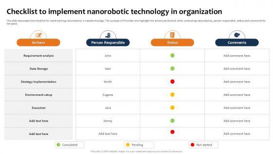 This slide showcases the checklist for implementing nanorobotics in nanotechnology. The purpose of this slide is to highlight the actions performed while conducting nanorobotics, person responsible, status and comments for the same. Find a pre-designed and impeccable Checklist To Implement Nanorobotic Technology In Organization PPT Template. The templates can ace your presentation without additional effort. You can download these easy-to-edit presentation templates to make your presentation stand out from others. So, what are you waiting for Download the template from Slidegeeks today and give a unique touch to your presentation. This slide showcases the checklist for implementing nanorobotics in nanotechnology. The purpose of this slide is to highlight the actions performed while conducting nanorobotics, person responsible, status and comments for the same.