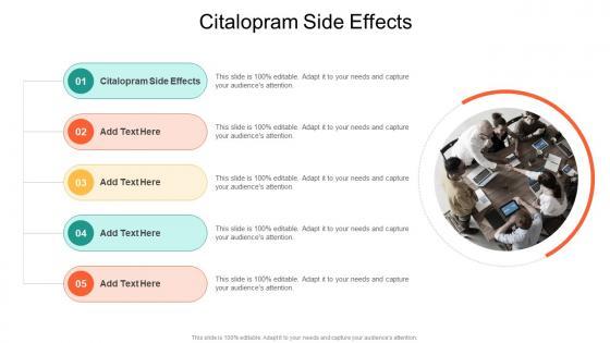 Introducing our well-designed Citalopram Side Effects In Powerpoint And Google Slides Cpb. This PowerPoint design presents information on topics like Citalopram Side Effects. As it is predesigned it helps boost your confidence level. It also makes you a better presenter because of its high-quality content and graphics. This PPT layout can be downloaded and used in different formats like PDF, PNG, and JPG. Not only this, it is available in both Standard Screen and Widescreen aspect ratios for your convenience. Therefore, click on the download button now to persuade and impress your audience. Our Citalopram Side Effects In Powerpoint And Google Slides Cpb are topically designed to provide an attractive backdrop to any subject. Use them to look like a presentation pro.