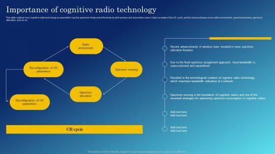 This slide outlines how cognitive radio technology is essential to use the spectrum freely and effectively by both primary and secondary users. It also consists of the CR cycle, and its various phases cover radio environment, spectrum sensing, spectrum allocation, and so on. Presenting this PowerPoint presentation, titled Cognitive Sensing Innovation Importance Of Cognitive Radio Technology Themes PDF, with topics curated by our researchers after extensive research. This editable presentation is available for immediate download and provides attractive features when used. Download now and captivate your audience. Presenting this Cognitive Sensing Innovation Importance Of Cognitive Radio Technology Themes PDF. Our researchers have carefully researched and created these slides with all aspects taken into consideration. This is a completely customizable Cognitive Sensing Innovation Importance Of Cognitive Radio Technology Themes PDF that is available for immediate downloading. Download now and make an impact on your audience. Highlight the attractive features available with our PPTs.