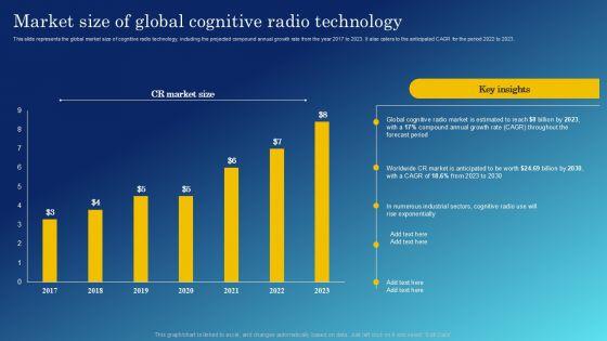 This slide represents the global market size of cognitive radio technology, including the projected compound annual growth rate from the year 2017 to 2023. It also caters to the anticipated CAGR for the period 2022 to 2023. Create an editable Cognitive Sensing Innovation Market Size Of Global Cognitive Radio Technology Topics PDF that communicates your idea and engages your audience. Whether you are presenting a business or an educational presentation, pre-designed presentation templates help save time. Cognitive Sensing Innovation Market Size Of Global Cognitive Radio Technology Topics PDF is highly customizable and very easy to edit, covering many different styles from creative to business presentations. Slidegeeks has creative team members who have crafted amazing templates. So, go and get them without any delay.