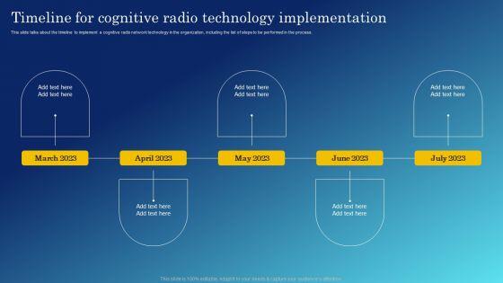This slide talks about the timeline to implement a cognitive radio network technology in the organization, including the list of steps to be performed in the process. The best PPT templates are a great way to save time, energy, and resources. Slidegeeks have 100 percent editable powerpoint slides making them incredibly versatile. With these quality presentation templates, you can create a captivating and memorable presentation by combining visually appealing slides and effectively communicating your message. Download Cognitive Radio Network IT Timeline For Cognitive Radio Technology Implementation Icons PDF from Slidegeeks and deliver a wonderful presentation.