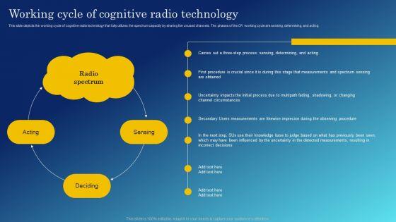 This slide depicts the working cycle of cognitive radio technology that fully utilizes the spectrum capacity by sharing the unused channels. The phases of the CR working cycle are sensing, determining, and acting. Slidegeeks has constructed Cognitive Sensor Network Working Cycle Of Cognitive Radio Technology Formats PDF after conducting extensive research and examination. These presentation templates are constantly being generated and modified based on user preferences and critiques from editors. Here, you will find the most attractive templates for a range of purposes while taking into account ratings and remarks from users regarding the content. This is an excellent jumping off point to explore our content and will give new users an insight into our top notch PowerPoint Templates.