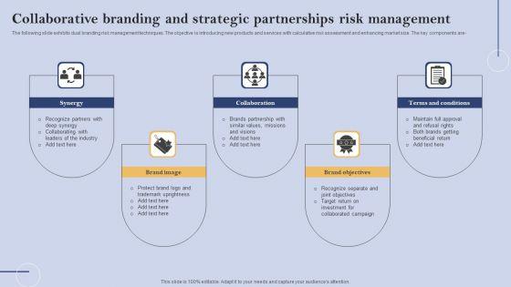 The following slide exhibits dual branding risk management techniques. The objective is introducing new products and services with calculative risk assessment and enhancing market size. The key components are- Presenting Collaborative Branding And Strategic Partnerships Risk Management Sample PDF to dispense important information. This template comprises five stages. It also presents valuable insights into the topics including Synergy, Brand Image, Collaboration. This is a completely customizable PowerPoint theme that can be put to use immediately. So, download it and address the topic impactfully.