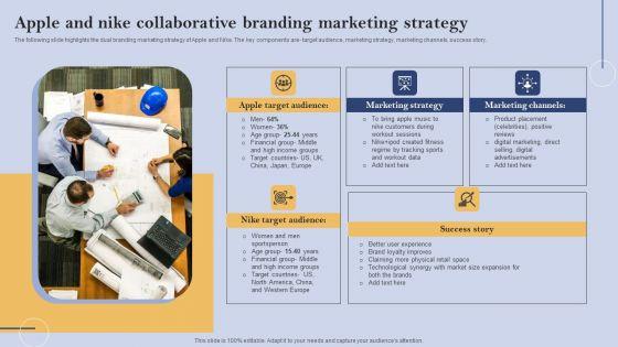 The following slide highlights the dual branding marketing strategy of Apple and Nike. The key components are- target audience, marketing strategy, marketing channels, success story. Presenting Apple And Nike Collaborative Branding Marketing Strategy Diagrams PDF to dispense important information. This template comprises four stages. It also presents valuable insights into the topics including Apple Target Audience, Marketing Strategy, Marketing Channels. This is a completely customizable PowerPoint theme that can be put to use immediately. So, download it and address the topic impactfully.