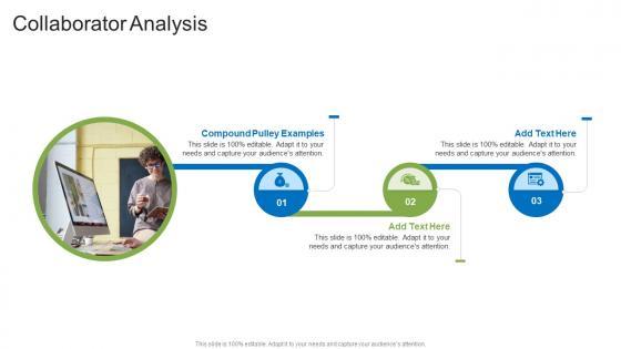 Introducing our well-designed Collaborator Analysis In Powerpoint And Google Slides Cpb. This PowerPoint design presents information on topics like Collaborator Analysis. As it is predesigned it helps boost your confidence level. It also makes you a better presenter because of its high-quality content and graphics. This PPT layout can be downloaded and used in different formats like PDF, PNG, and JPG. Not only this, it is available in both Standard Screen and Widescreen aspect ratios for your convenience. Therefore, click on the download button now to persuade and impress your audience. Our Collaborator Analysis In Powerpoint And Google Slides Cpb are topically designed to provide an attractive backdrop to any subject. Use them to look like a presentation pro.