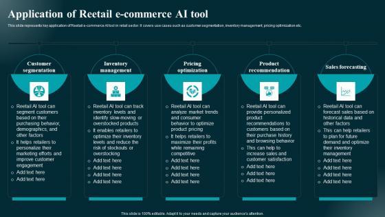 This slide represents key application of Reetail e-commerce AI tool in retail sector. It covers use cases such as customer segmentation, inventory management, pricing optimization etc. Crafting an eye-catching presentation has never been more straightforward. Let your presentation shine with this tasteful yet straightforward Application Of Reetail E Commerce AI Tool Applications And Impact Rules Pdf template. It offers a minimalistic and classy look that is great for making a statement. The colors have been employed intelligently to add a bit of playfulness while still remaining professional. Construct the ideal Application Of Reetail E Commerce AI Tool Applications And Impact Rules Pdf that effortlessly grabs the attention of your audience Begin now and be certain to wow your customers This slide represents key application of Reetail e-commerce AI tool in retail sector. It covers use cases such as customer segmentation, inventory management, pricing optimization etc.