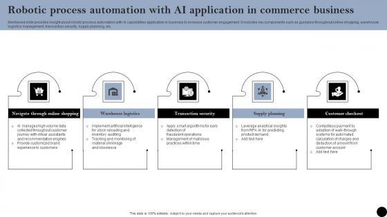 Mentioned slide provides insight about robotic process automation with AI capabilities application in business to increase customer engagement. It includes key components such as guidance throughout online shopping, warehouse logistics management, transaction security, supply planning, etc. Showcasing this set of slides titled Robotic Process Automation With AI Application In Commerce Business Graphics Pdf. The topics addressed in these templates are Online Shopping, Warehouse Logistics Management, Transaction Security. All the content presented in this PPT design is completely editable. Download it and make adjustments in color, background, font etc. as per your unique business setting. Mentioned slide provides insight about robotic process automation with AI capabilities application in business to increase customer engagement. It includes key components such as guidance throughout online shopping, warehouse logistics management, transaction security, supply planning, etc.