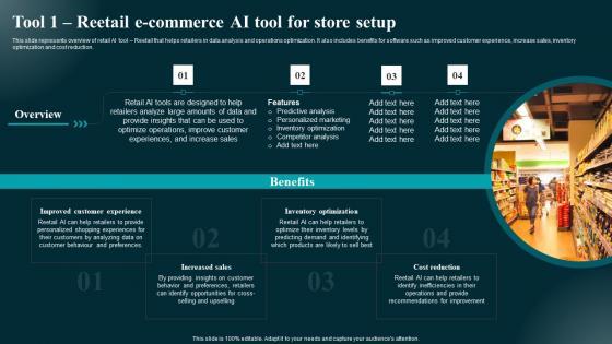 This slide represents overview of retail AI tool Reetail that helps retailers in data analysis and operations optimization. It also includes benefits for software such as improved customer experience, increase sales, inventory optimization and cost reduction. Are you in need of a template that can accommodate all of your creative concepts This one is crafted professionally and can be altered to fit any style. Use it with Google Slides or PowerPoint. Include striking photographs, symbols, depictions, and other visuals. Fill, move around, or remove text boxes as desired. Test out color palettes and font mixtures. Edit and save your work, or work with colleagues. Download Tool 1 Reetail E Commerce AI Tool For Store Setup Applications And Impact Template Pdf and observe how to make your presentation outstanding. Give an impeccable presentation to your group and make your presentation unforgettable. This slide represents overview of retail AI tool Reetail that helps retailers in data analysis and operations optimization. It also includes benefits for software such as improved customer experience, increase sales, inventory optimization and cost reduction.
