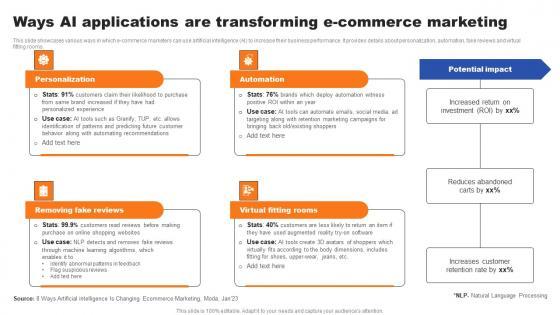 This slide showcases various ways in which e-commerce marketers can use artificial intelligence AI to increase their business performance. It provides details about personalization, automation, fake reviews and virtual fitting rooms. Slidegeeks is one of the best resources for PowerPoint templates. You can download easily and regulate Ways AI Applications Are Transforming E Commerce Marketing Sample PDF for your personal presentations from our wonderful collection. A few clicks is all it takes to discover and get the most relevant and appropriate templates. Use our Templates to add a unique zing and appeal to your presentation and meetings. All the slides are easy to edit and you can use them even for advertisement purposes.