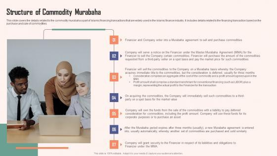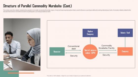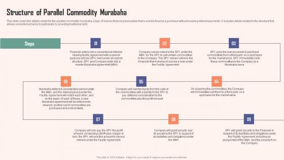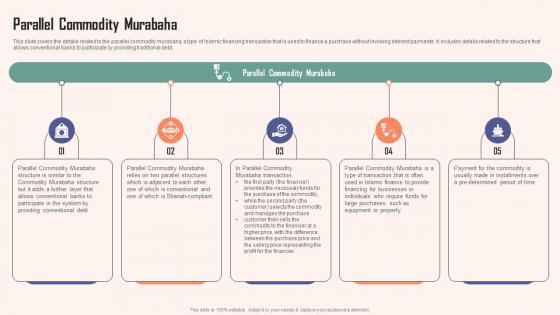 This slide covers the details related to the parallel commodity murabaha, a type of Islamic financing transaction that is used to finance a purchase without involving interest payments. It includes details related to the structure that allows conventional banks to participate by providing traditional debt. Slidegeeks is here to make your presentations a breeze with With our easy-to-use and customizable templates, you can focus on delivering your ideas rather than worrying about formatting. With a variety of designs to choose from, you are sure to find one that suits your needs. And with animations and unique photos, illustrations, and fonts, you can make your presentation pop. So whether you are giving a sales pitch or presenting to the board, make sure to check out Slidegeeks first This slide covers the details related to the parallel commodity murabaha, a type of Islamic financing transaction that is used to finance a purchase without involving interest payments. It includes details related to the structure that allows conventional banks to participate by providing traditional debt.