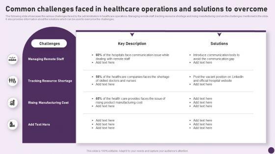 The following slide showcases the various challenges faced by the administrators in healthcare operations. Managing remote staff, tracking resource shortage and rising manufacturing cost are the challenges mentioned in the slide. It also provides information about the solutions which can be used to overcome the challenges. Take your projects to the next level with our ultimate collection of Common Challenges Faced In Healthcare Operations And Solutions To Overcome Structure PDF. Slidegeeks has designed a range of layouts that are perfect for representing task or activity duration, keeping track of all your deadlines at a glance. Tailor these designs to your exact needs and give them a truly corporate look with your own brand colors they will make your projects stand out from the rest.