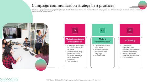 This slides highlight some messaging strategy best practices to effectively understand the market and ensure campaign success. It includes best practices such as keep consistency, make it personal, and A or B testing. Presenting Campaign Communication Strategy Best Practices Structure PDF to dispense important information. This template comprises three stages. It also presents valuable insights into the topics including Maintain Consistency Across Channels, Customer-Oriented, A Or B Testing. This is a completely customizable PowerPoint theme that can be put to use immediately. So, download it and address the topic impactfully.