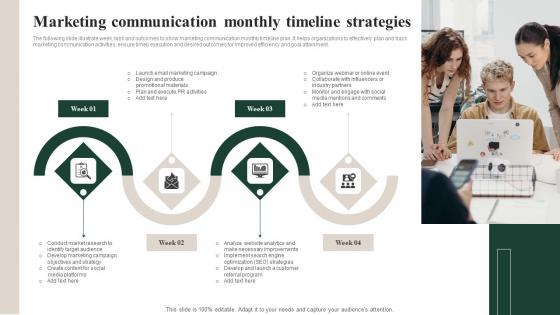 The following slide illustrate week, task and outcomes to show marketing communication monthly timeline plan. It helps organizations to effectively plan and track marketing communication activities, ensure timely execution and desired outcomes for improved efficiency and goal attainment. Pitch your topic with ease and precision using this Marketing Communication Monthly Timeline Strategies Template Pdf This layout presents information on Marketing Campaign, Social Media Platforms It is also available for immediate download and adjustment. So, changes can be made in the color, design, graphics or any other component to create a unique layout. The following slide illustrate week, task and outcomes to show marketing communication monthly timeline plan. It helps organizations to effectively plan and track marketing communication activities, ensure timely execution and desired outcomes for improved efficiency and goal attainment.