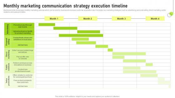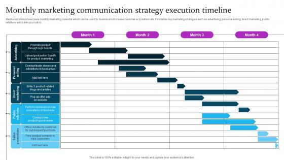 Mentioned slide showcases monthly marketing calendar which can be used by business to increase customer acquisition rate. It includes key marketing strategies such as advertising, personal selling, direct marketing, public relations and sales promotion. Slidegeeks is here to make your presentations a breeze with Monthly Marketing Communication Strategy Execution Timeline Clipart PDF With our easy to use and customizable templates, you can focus on delivering your ideas rather than worrying about formatting. With a variety of designs to choose from, you are sure to find one that suits your needs. And with animations and unique photos, illustrations, and fonts, you can make your presentation pop. So whether you are giving a sales pitch or presenting to the board, make sure to check out Slidegeeks first.
