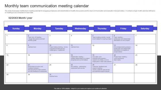 The slide showcases monthly team meeting calendar for engaging employees and stakeholders in healthy discussions and for clear communication and evaluation of project status . It contains single month calendar with tasks or meetings to be conducted on each date . The best PPT templates are a great way to save time, energy, and resources. Slidegeeks have 100 percent editable powerpoint slides making them incredibly versatile. With these quality presentation templates, you can create a captivating and memorable presentation by combining visually appealing slides and effectively communicating your message. Download Strategies To Build Meaningful Monthly Team Communication Meeting Calendar Graphics PDF from Slidegeeks and deliver a wonderful presentation. The slide showcases monthly team meeting calendar for engaging employees and stakeholders in healthy discussions and for clear communication and evaluation of project status . It contains single month calendar with tasks or meetings to be conducted on each date .