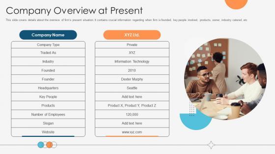 This slide covers details about the overview of firms present situation. It contains crucial information regarding when firm is founded, key people involved, products, owner, industry catered, etc. Do you have to make sure that everyone on your team knows about any specific topic I yes, then you should give Company Overview At Present Increasing Profitability Through Better Product a try. Our experts have put a lot of knowledge and effort into creating this impeccable Company Overview At Present Increasing Profitability Through Better Product. You can use this template for your upcoming presentations, as the slides are perfect to represent even the tiniest detail. You can download these templates from the Slidegeeks website and these are easy to edit. So grab these today This slide covers details about the overview of firms present situation. It contains crucial information regarding when firm is founded, key people involved, products, owner, industry catered, etc.