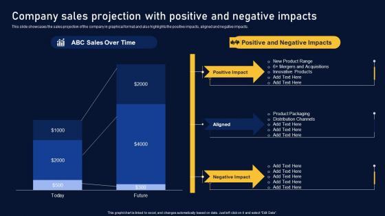 This slide showcases the sales projection of the company in graphical format and also highlights the positive impacts, aligned and negative impacts. Are you in need of a template that can accommodate all of your creative concepts This one is crafted professionally and can be altered to fit any style. Use it with Google Slides or PowerPoint. Include striking photographs, symbols, depictions, and other visuals. Fill, move around, or remove text boxes as desired. Test out color palettes and font mixtures. Edit and save your work, or work with colleagues. Download Company Sales Projection With Positive And Negative Impacts Information PDF and observe how to make your presentation outstanding. Give an impeccable presentation to your group and make your presentation unforgettable.