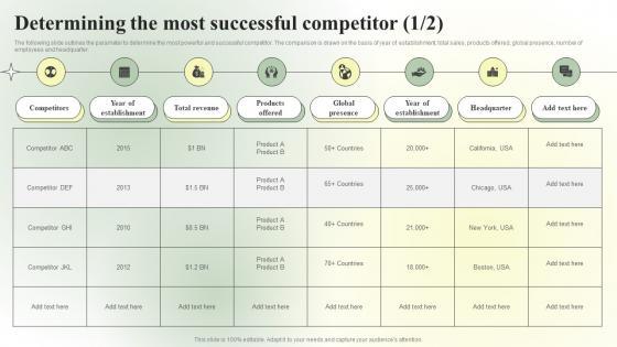 The following slide outlines the parameter to determine the most powerful and successful competitor. The comparison is drawn on the basis of year of establishment, total sales, products offered, global presence, number of employees and headquarter. There are so many reasons you need a Competitive Branding Strategic Determining The Most Successful Guidelines PDF The first reason is you can not spend time making everything from scratch, Thus, Slidegeeks has made presentation templates for you too. You can easily download these templates from our website easily. The following slide outlines the parameter to determine the most powerful and successful competitor. The comparison is drawn on the basis of year of establishment, total sales, products offered, global presence, number of employees and headquarter.