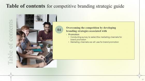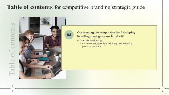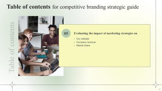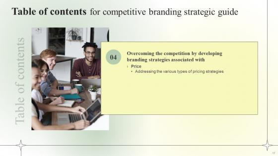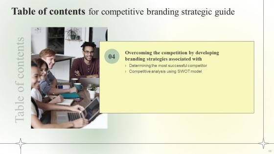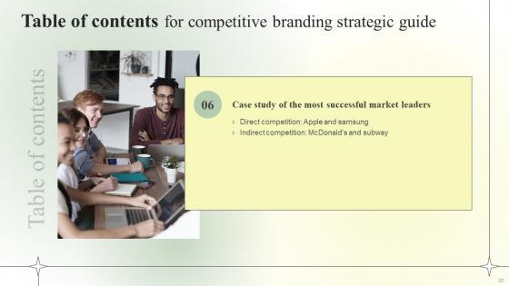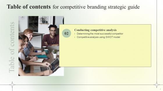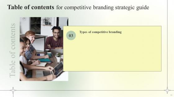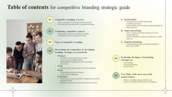 This Table Of Contents For Competitive Branding Strategic Guide Topics PDF from Slidegeeks makes it easy to present information on your topic with precision. It provides customization options, so you can make changes to the colors, design, graphics, or any other component to create a unique layout. It is also available for immediate download, so you can begin using it right away. Slidegeeks has done good research to ensure that you have everything you need to make your presentation stand out. Make a name out there for a brilliant performance. Our Table Of Contents For Competitive Branding Strategic Guide Topics PDF are topically designed to provide an attractive backdrop to any subject. Use them to look like a presentation pro.
